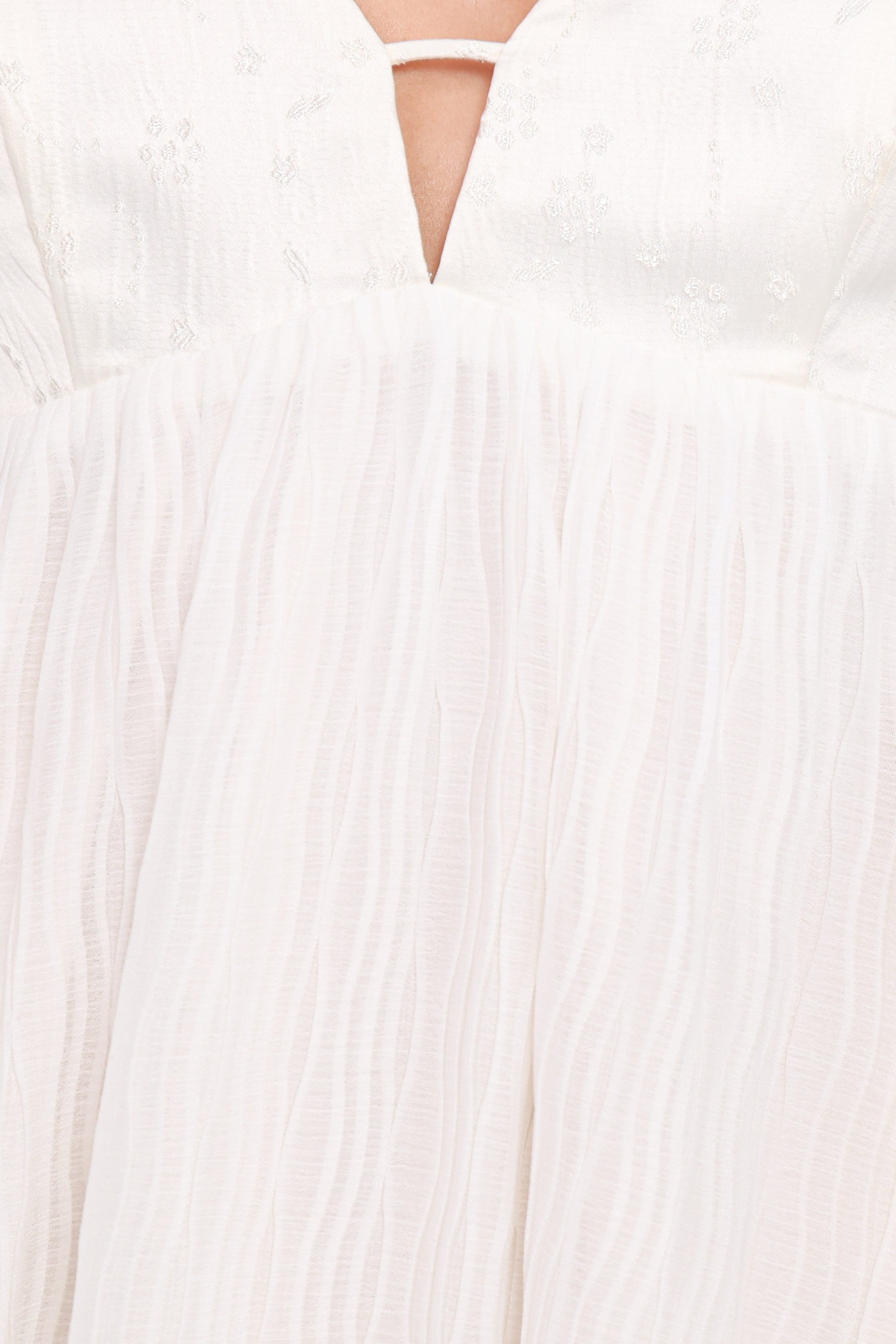 With its mini length and sleek v neckline. this dress is designed to accentuate your natural elegance. The cut-out detail on the bust adds a modern. chic twist. while the unique bubble elasticized hemline creates a playful silhouette.
